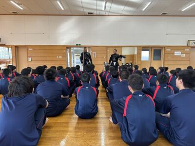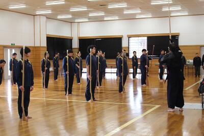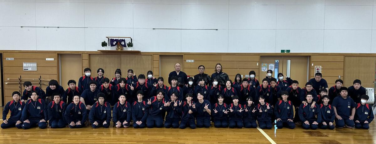 令和7年12月10日(水)、体育科特別授業として、全日本銃剣道連盟の衛藤敬輔先生、国際銃剣道連盟の Baptiste Tavernie 先生を講師にお迎えし、「武道・銃剣道教室」を開催しました。2・3校時には2年生(農業科・農業機械科)、5・6校時には1年生(全クラス)が参加しました。