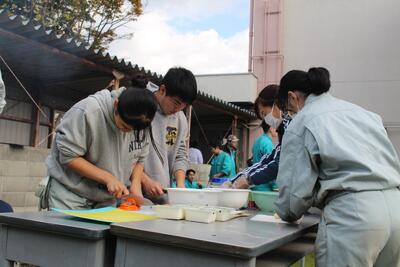 学校で育てた新米や野菜、地元産の豚肉を使い、各クラスが工夫を凝らしたおにぎりと豚汁を調理しました。決められた基本食材に加え、各クラスで用意した調味料や具材を活かし、個性豊かな味わいが並びました。