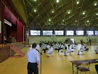 5月18日(木),地区総体報告会および県総体壮行式を行いました。本校からはバレーボール部,バスケットボール部,卓球部,陸上競技部,テニス部,サッカー部,柔道部,剣道部から大会成績の報告と,県総体への意気込みについて話しがありました。最後に,本校応援団よりエールをもらい,県総体に向けて気持ちを高めていました。