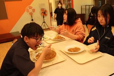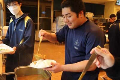 漫画やアニメでしか見られないような山盛りカレーにする寮生たち・・・