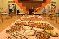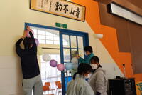 こちらは夕食会場の装飾です。今年は食堂入り口をバルーンガーランドで飾り,バルーンアート一色にしました。