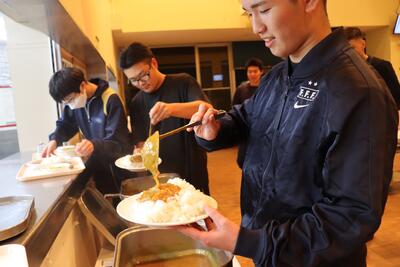 漫画やアニメでしか見られないような山盛りカレーにする寮生たち・・・
