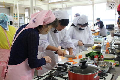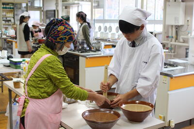 令和5年10月25日(水)、色麻町ヘルスメイトの方を講師に迎え、本校生活技術科3年生が伝統・郷土料理 の「えごま餅、白和え、ひきな汁」の作り方について学びました。