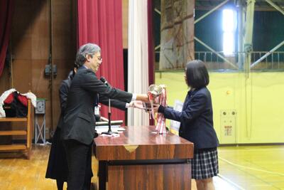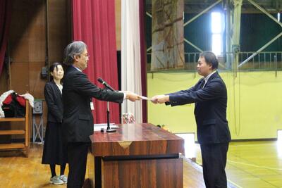 12月23日(火)、本校では賞状伝達式と冬休み前集会を行いました。 はじめに行われた賞状伝達式では、学業や部活動、各種コンクールなどで優れた成果を収めた生徒たちが壇上に上がり、校長先生より賞状が手渡されました。