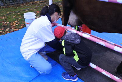 11月25日(金),農業科畜産専攻生と食農科学部に所属する生徒などが仙台市の小学校で「モーモースクール」を行いました。本校は全国でも5校しかない酪農教育ファーム認証牧場です。当日は,生徒が先生となり,小学生に牛について話をしたり,乳搾りの仕方について説明などをしながら,食と命の大切さを伝えました。
