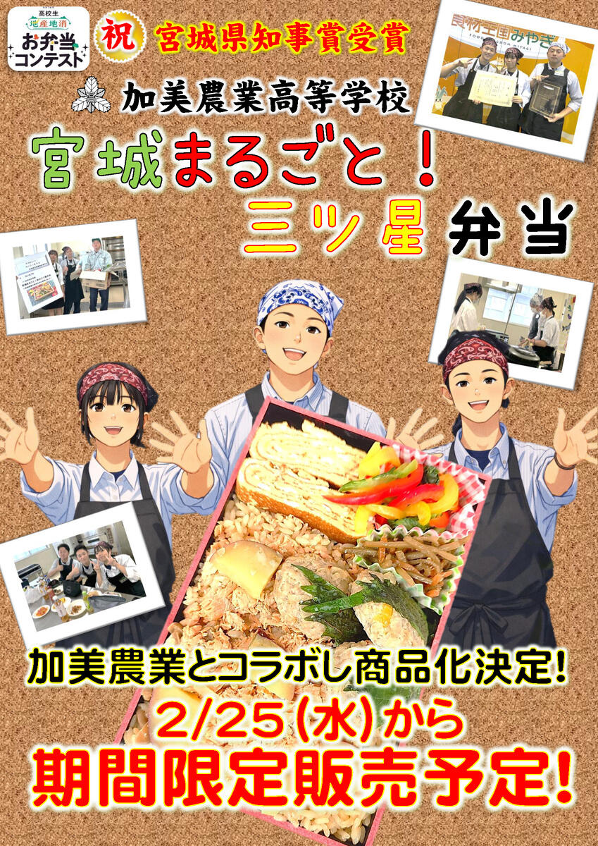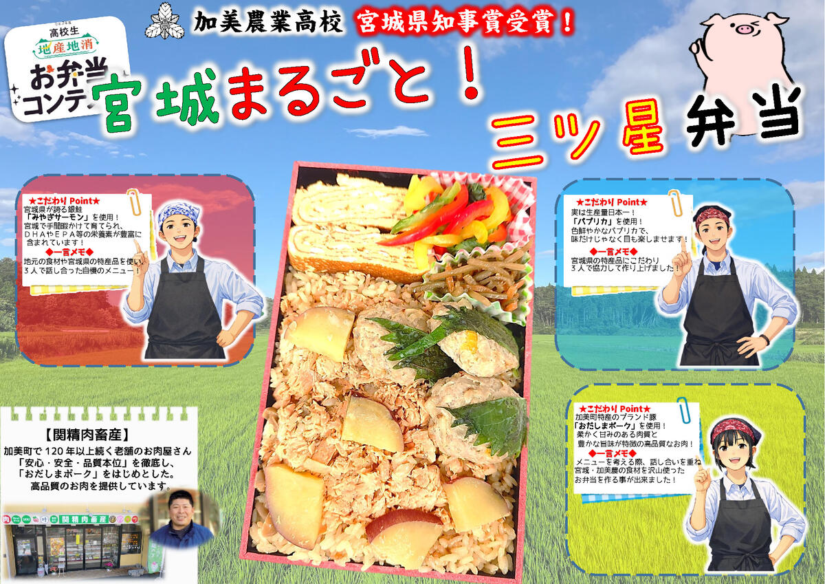 「高校生地産地消お弁当コンテスト」において、本校の農業科3年生が考案したお弁当が宮城県知事賞を受賞しました。